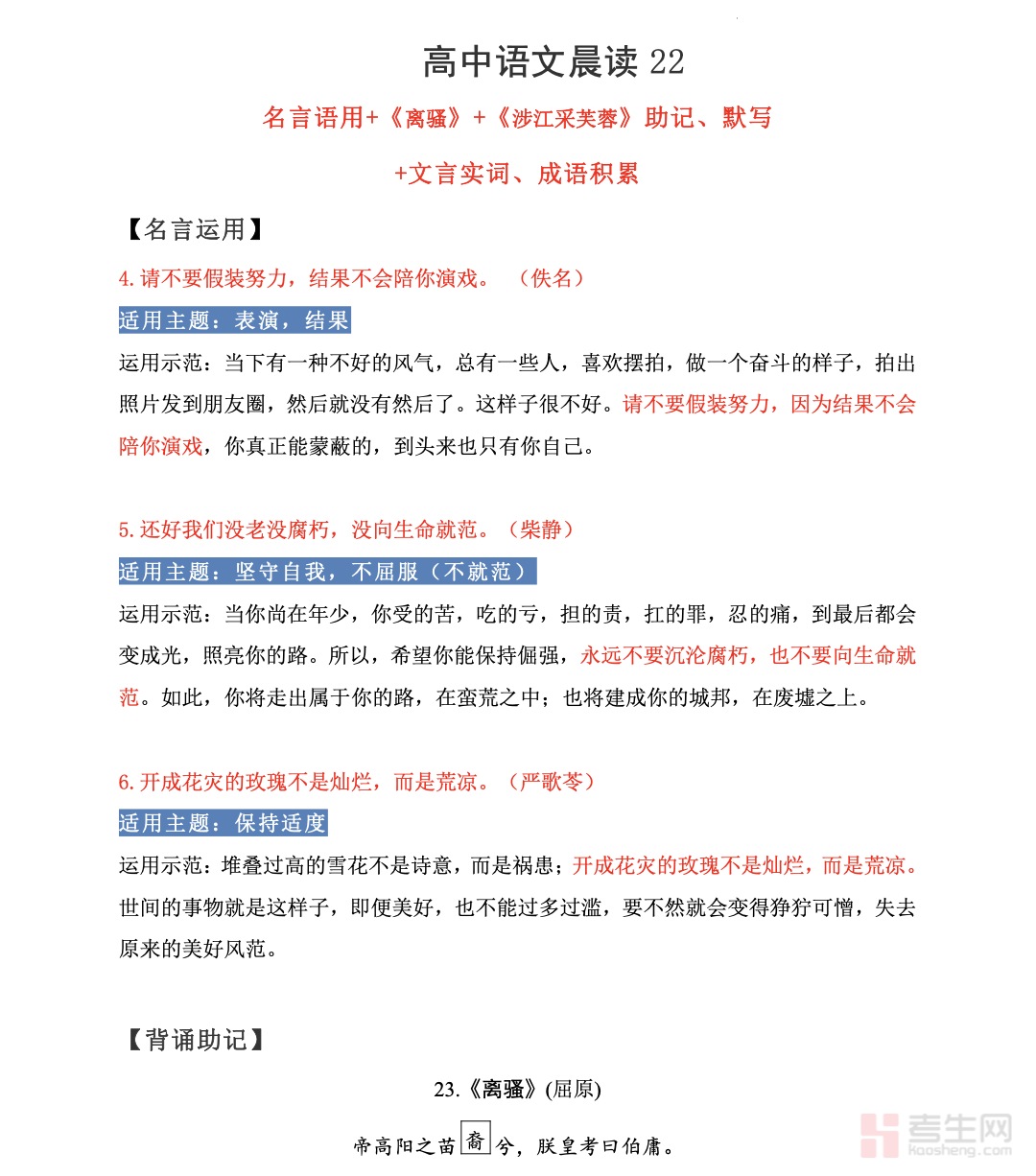 【激情晨读】古诗文知识与热点主题语段积累(新高中语文课标60篇)(离骚+涉江采芙蓉)