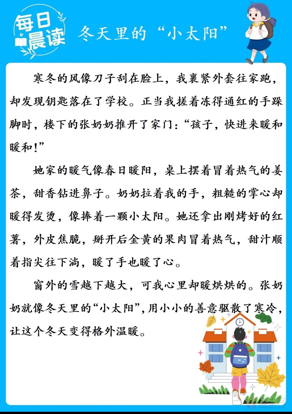 这份资料以 “冬日里的‘小太阳’” 为核心,将冬日的清冷景致与生活中的温暖瞬间紧密融合,既是晨读时治愈心灵的 “温暖读本”,也是练笔时激发创作灵感的 “素材宝库”。在晨读部分,文字围绕 “冬日里的‘小太阳’” 展开多维度刻画,让每一份温暖都鲜活可感: