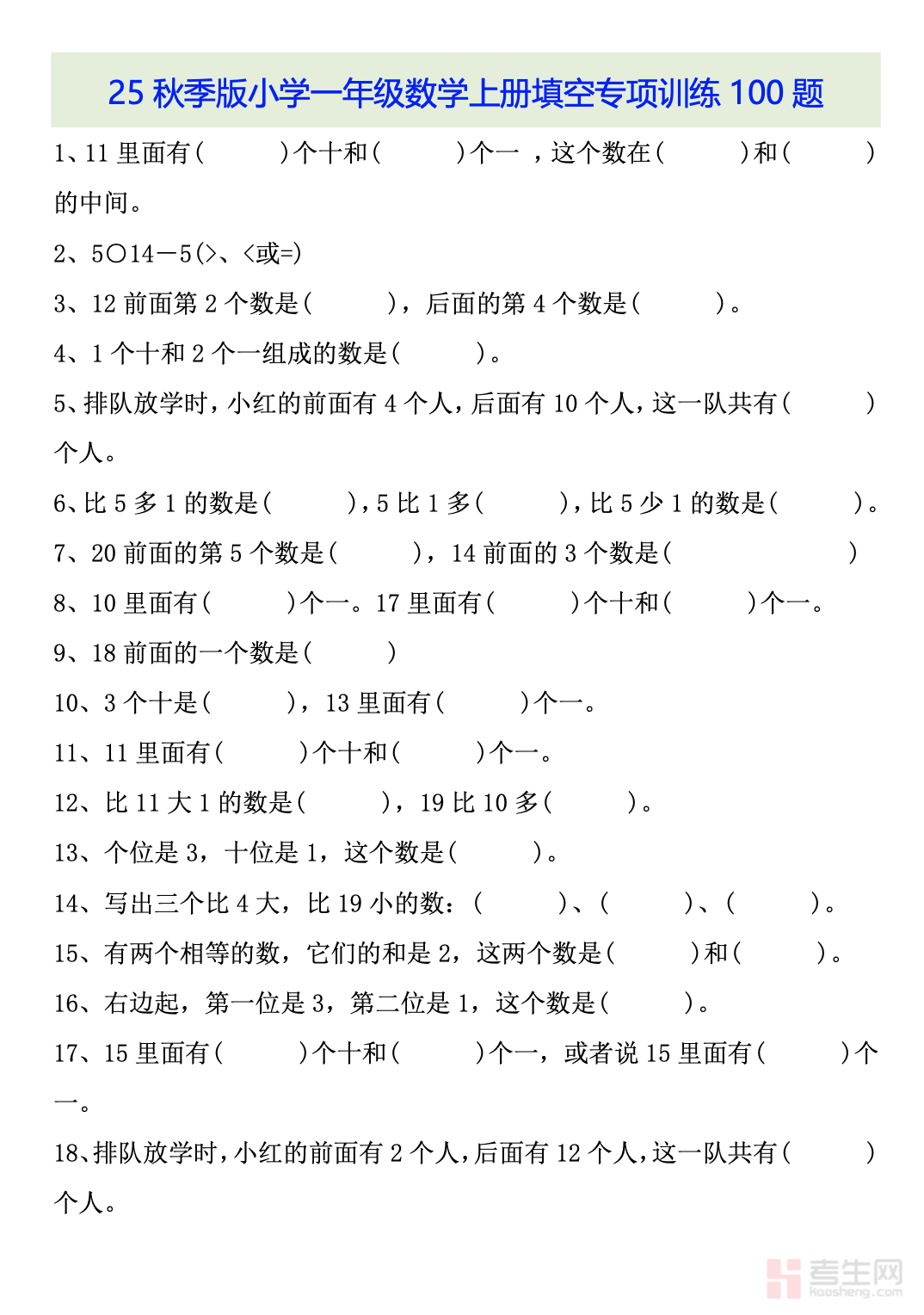 【2025秋新版】一年级数学上册基础知识填空专项训练100题