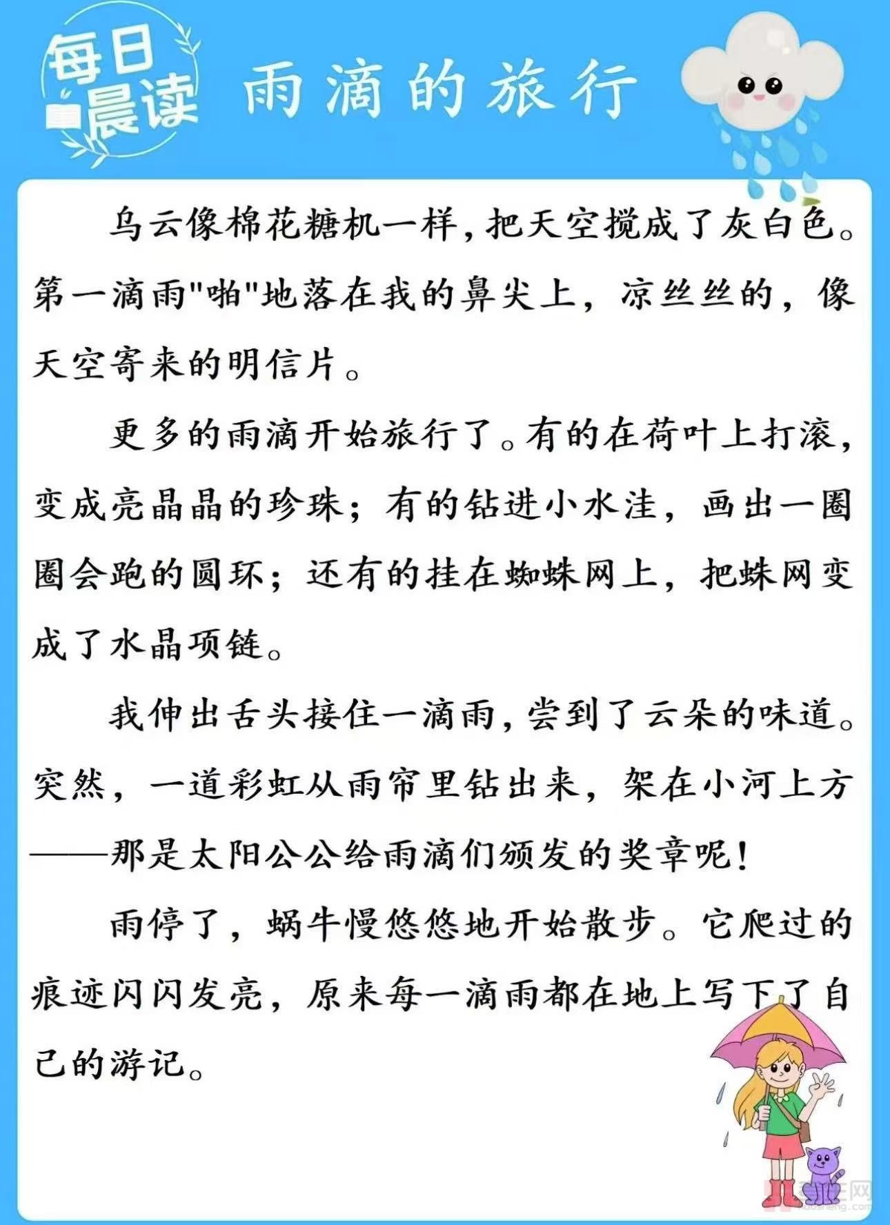 无论你是学生群体,想积累自然写景与创意写作素材,让作文摆脱平淡,在考试中展现对生活的细腻观察;还是家长,希望为孩子寻找兼具趣味与知识性的晨读资料,培养其观察能力与想象力;亦或是热爱自然的成年人,想以文字重温雨天的诗意与纯粹,这份《雨滴的旅行》晨读+练笔资料都能精准满足你的需求。