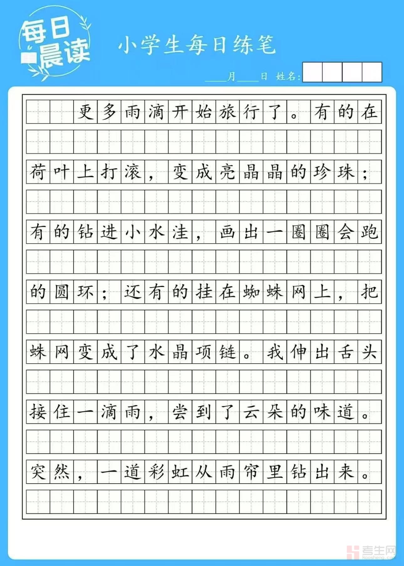 资料已上传至考生网,下载路径简单便捷:登录考生网,在搜索栏输入“《雨滴的旅行》晨读+练笔资料”,即可一键获取。你可以在清晨伴着晨光品读雨滴的旅行故事,唤醒一天的创意与温情;也可以在雨天窗边,结合实际观察完成练笔题目,将雨滴的灵动与自然的诗意付诸文字。坚持每日阅读与练习,不仅能显著提升文字表达能力,更能让你学会从平凡的自然现象中发现美好,让写作成为记录自然、传递创意的方式。
