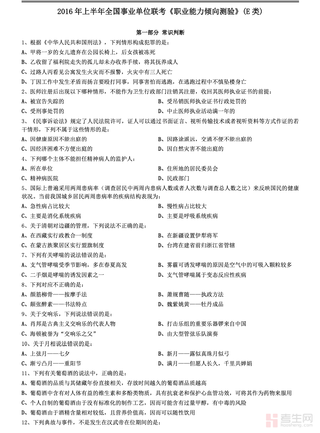 全国事业单位联考《职业能力倾向测验》真题(E类)(2016年上半年)