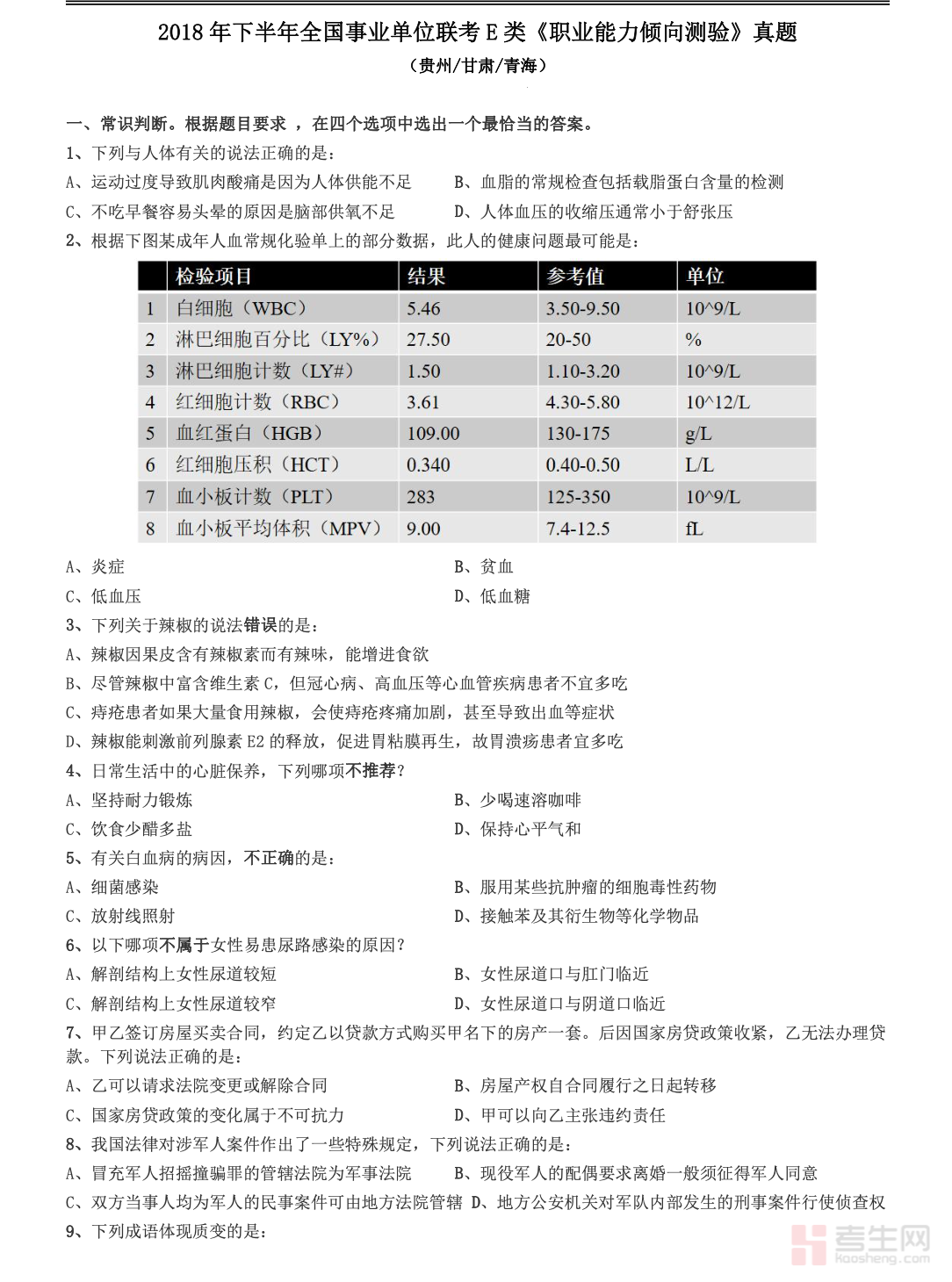 全国事业单位联考《职业能力倾向测验》真题(E类)(2018年下半年)