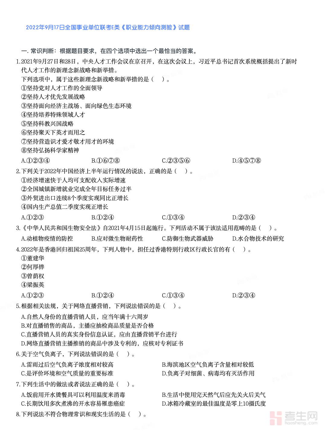 全国事业单位联考《职业能力倾向测验》真题(E类)(2022年下半年)