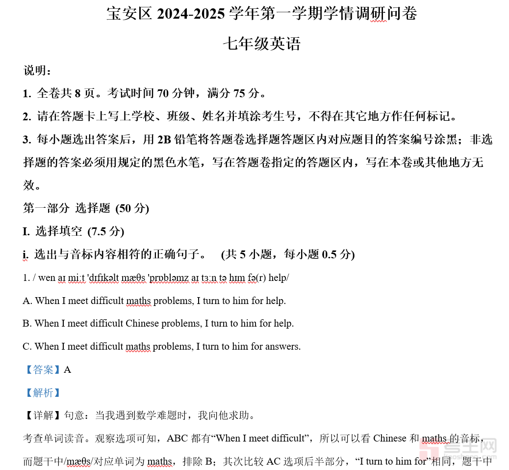 精品解析:广东省深圳市宝安区2024-2025学年七年级上学期期末考试英语题