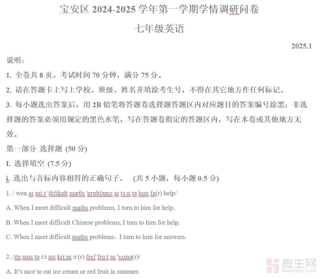 精品解析:广东省深圳市宝安区2024-2025学年七年级上学期期末考试英语题
