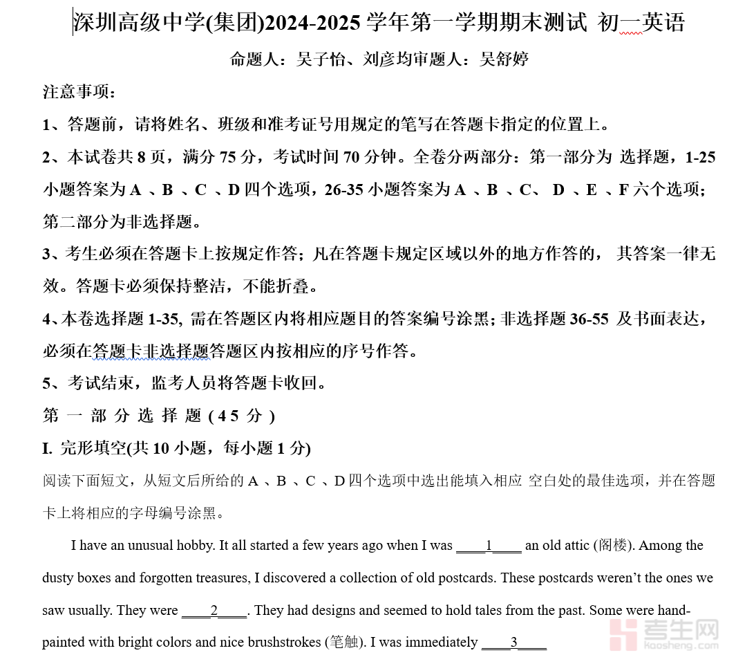 精品解析:广东省深圳市高级中学2024-2025学年七年级上学期期末考试英语试题
