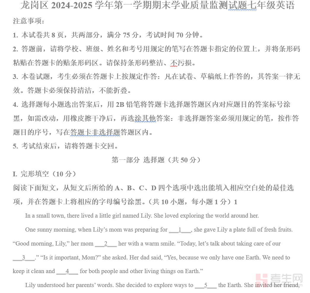 精品解析:广东省深圳市龙岗区2024-2025学年七年级上学期期末考试英语题