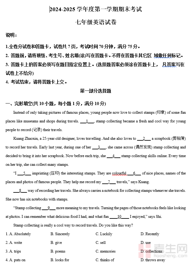 精品解析:广东省深圳市高级中学2024-2025学年七年级上学期期末考试英语试题