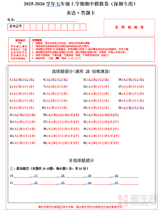 2025-2026年七年级英语上学期期中模拟卷(深圳专用,新教材沪教版)(答题卡)