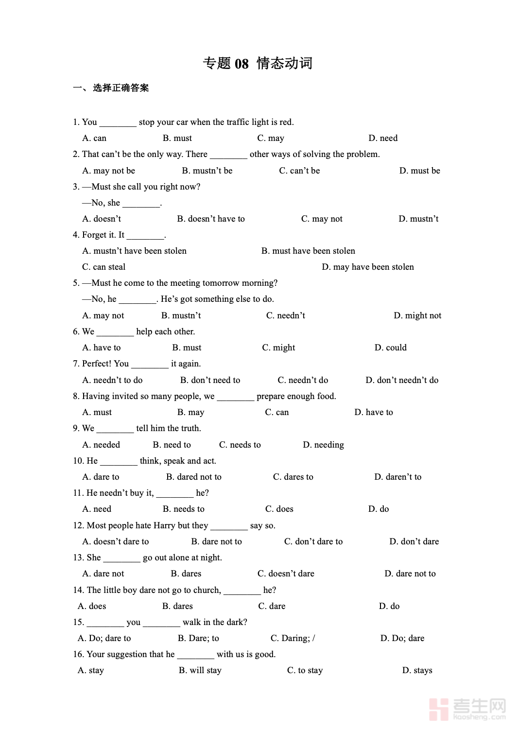 专题 08 情态动词(精练)—— 中职高职春季高考英语科目总复习(广东专用)