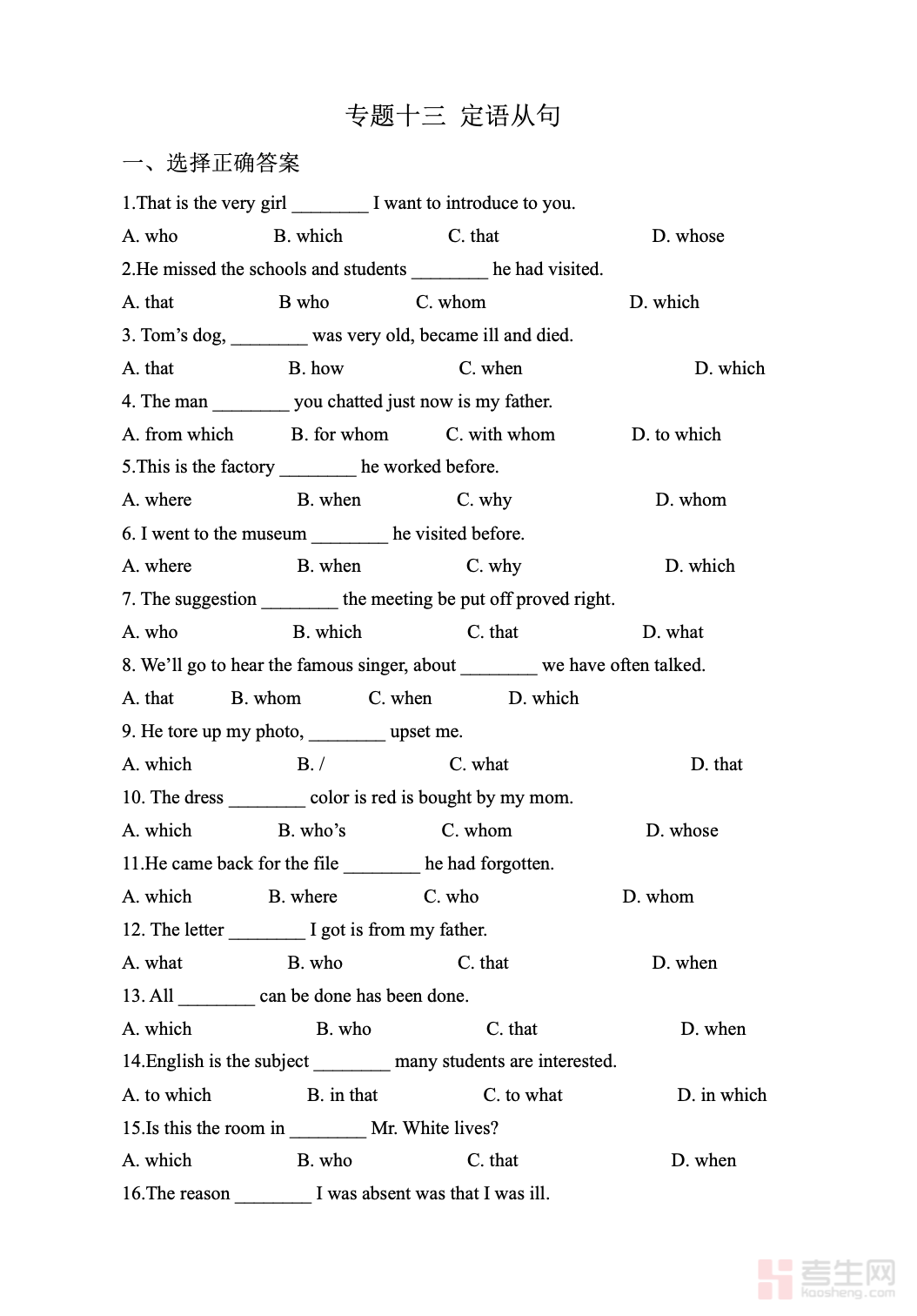 专题 13 定语从句(精练)—— 中职高职春季高考英语科目总复习(广东专用)