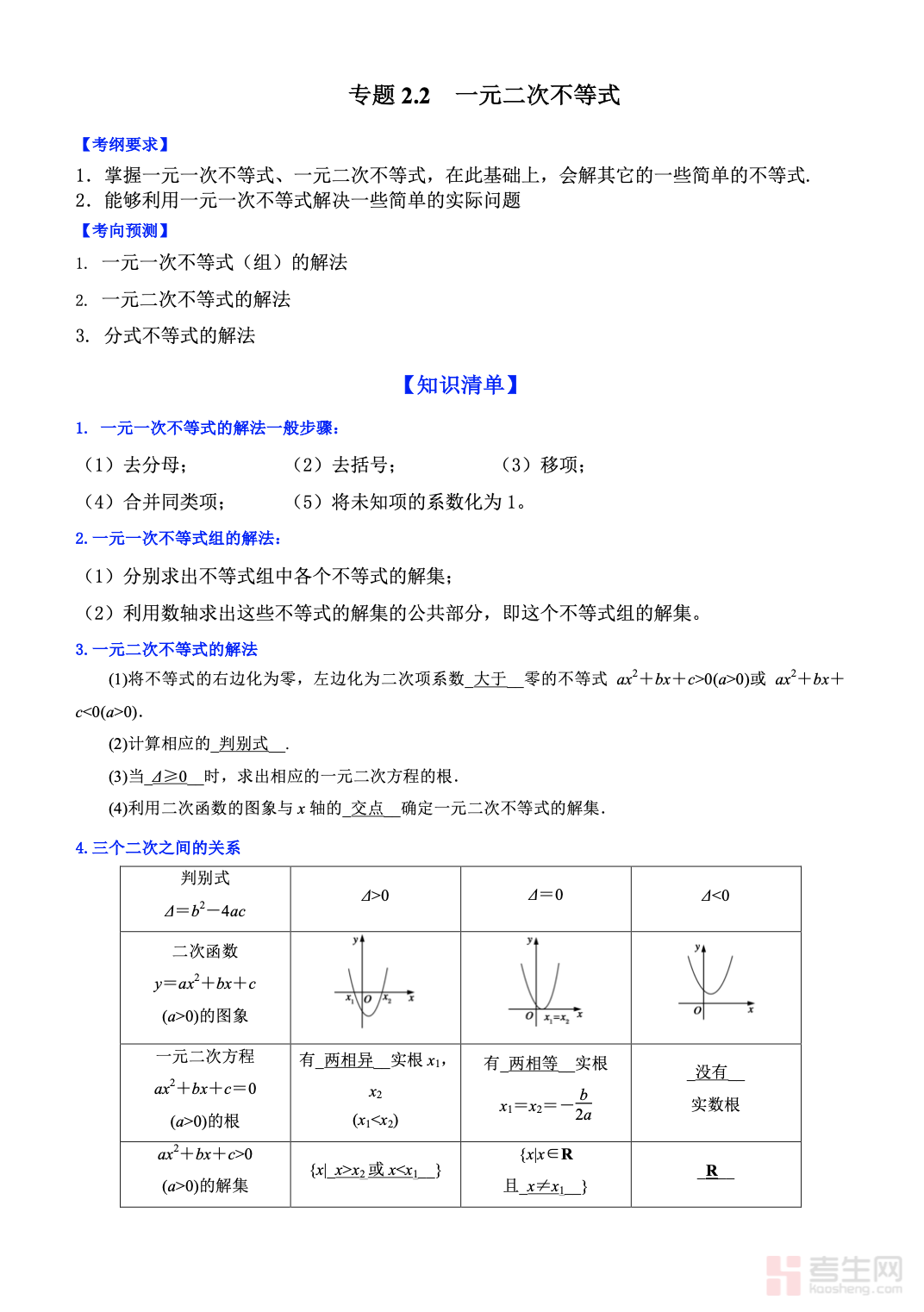 2.2 一元二次不等式 高考数学一轮艺体生基础复习讲义(新高考)(教师版)