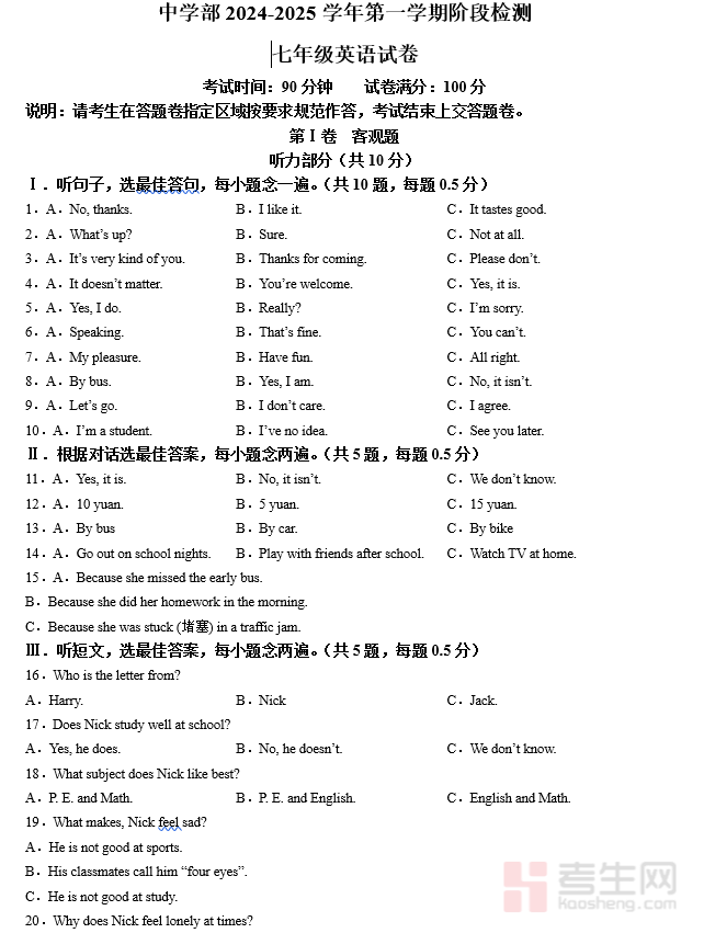 深圳实验学校2024-2025学年度第一学期期末考试初一年级 英语试卷(学生版)
