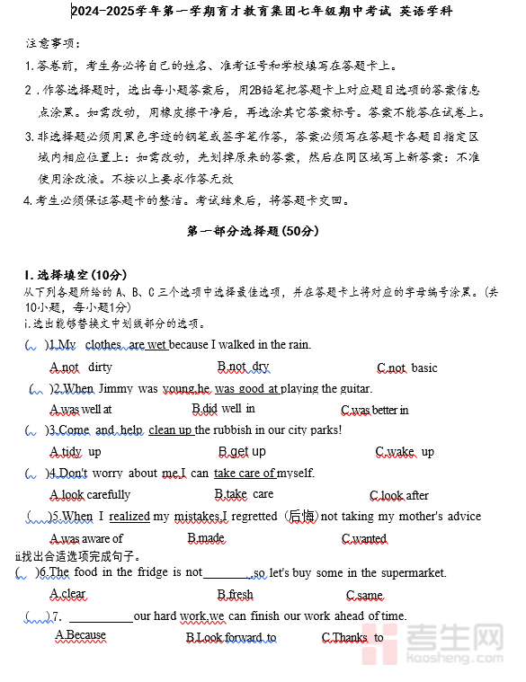 广东省深圳市南山区育才中学2024-2025学年七年级上学期期中测试英语试卷