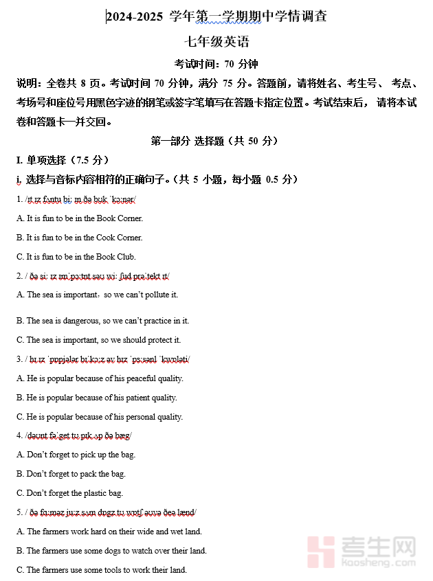 深圳实验学校2024-2025学年度第一学期期末考试初一年级 英语试卷(学生版)
