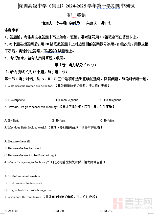 深圳实验学校2024-2025学年度第一学期期末考试初一年级 英语试卷(学生版)