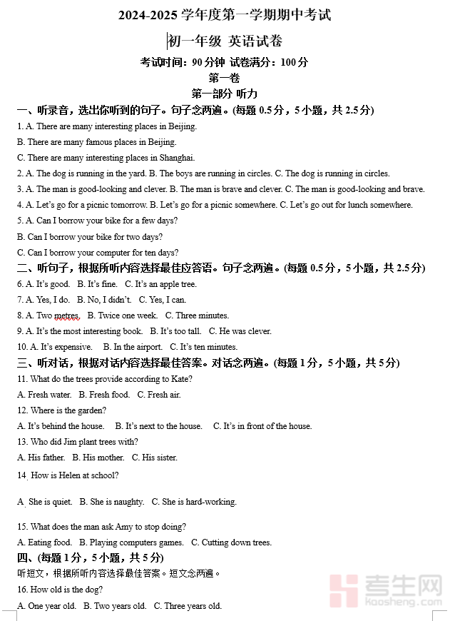 深圳实验学校2024-2025学年度第一学期期末考试初一年级 英语试卷(学生版)