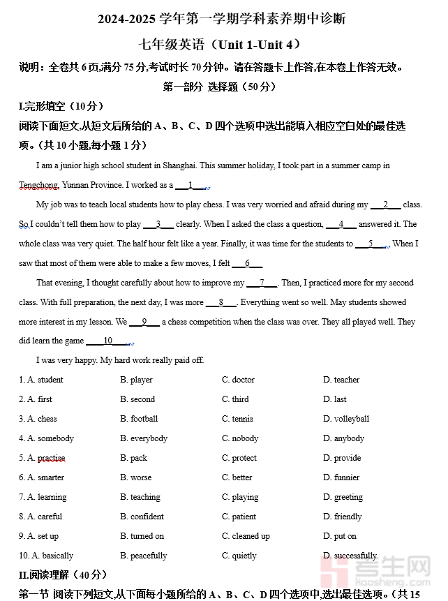 深圳实验学校2024-2025学年度第一学期期末考试初一年级 英语试卷(学生版)