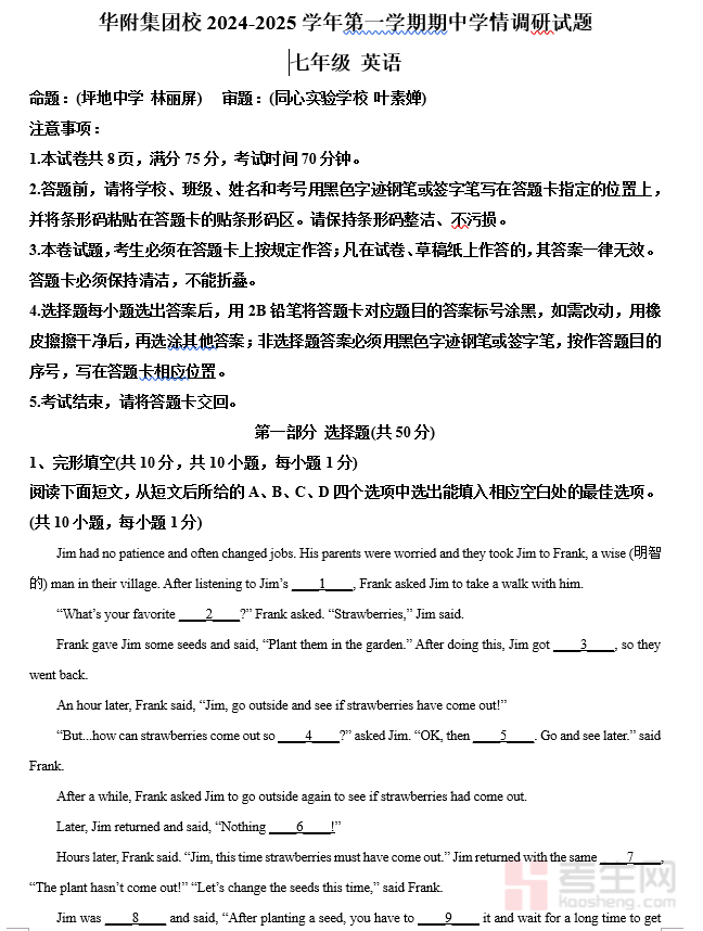 深圳实验学校2024-2025学年度第一学期期末考试初一年级 英语试卷(学生版)