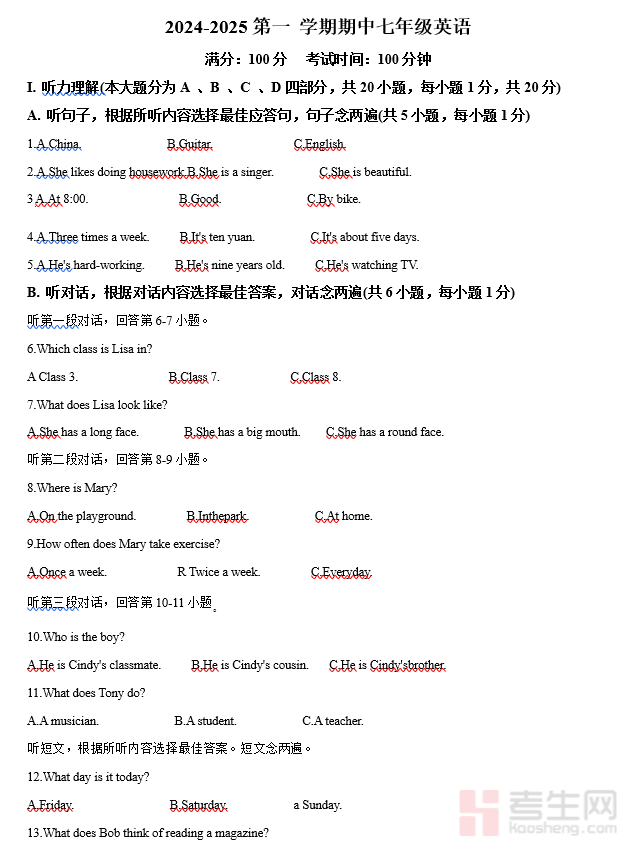 精品解析:广东省深圳市高级中学2024-2025学年七年级上学期期末考试英语试题