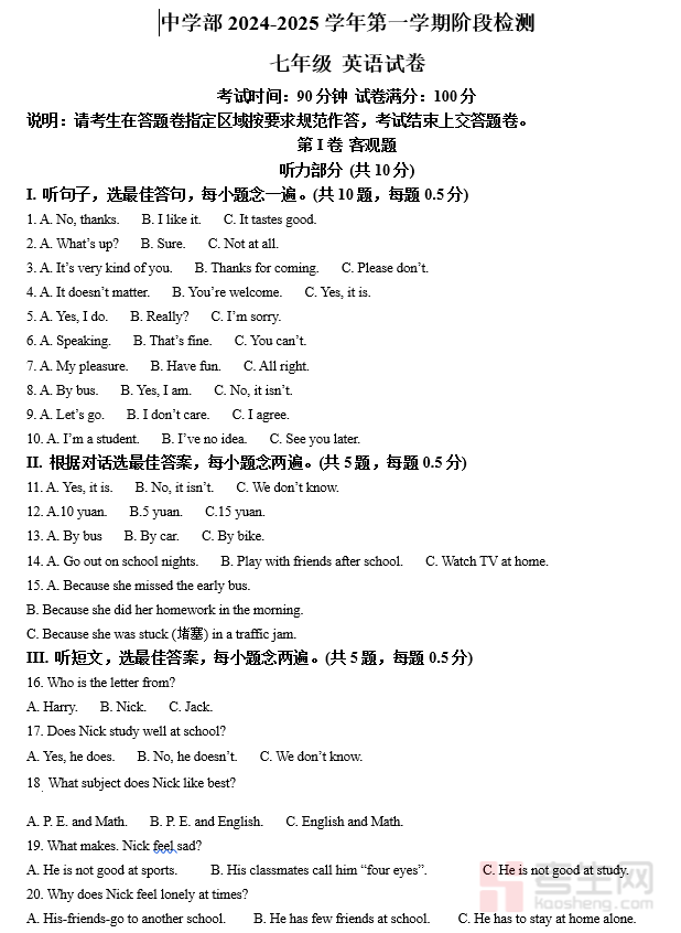 深圳实验学校2024-2025学年度第一学期期末考试初一年级 英语试卷(学生版)