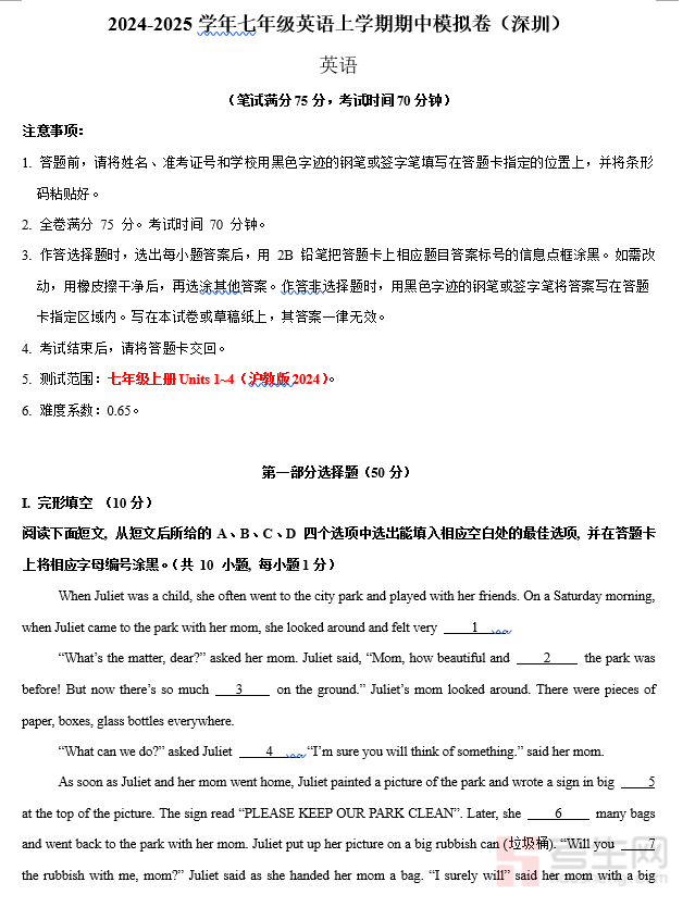 深圳实验学校2024-2025学年度第一学期期末考试初一年级 英语试卷(学生版)