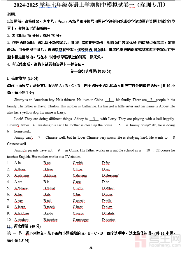 深圳实验学校2024-2025学年度第一学期期末考试初一年级 英语试卷(学生版)