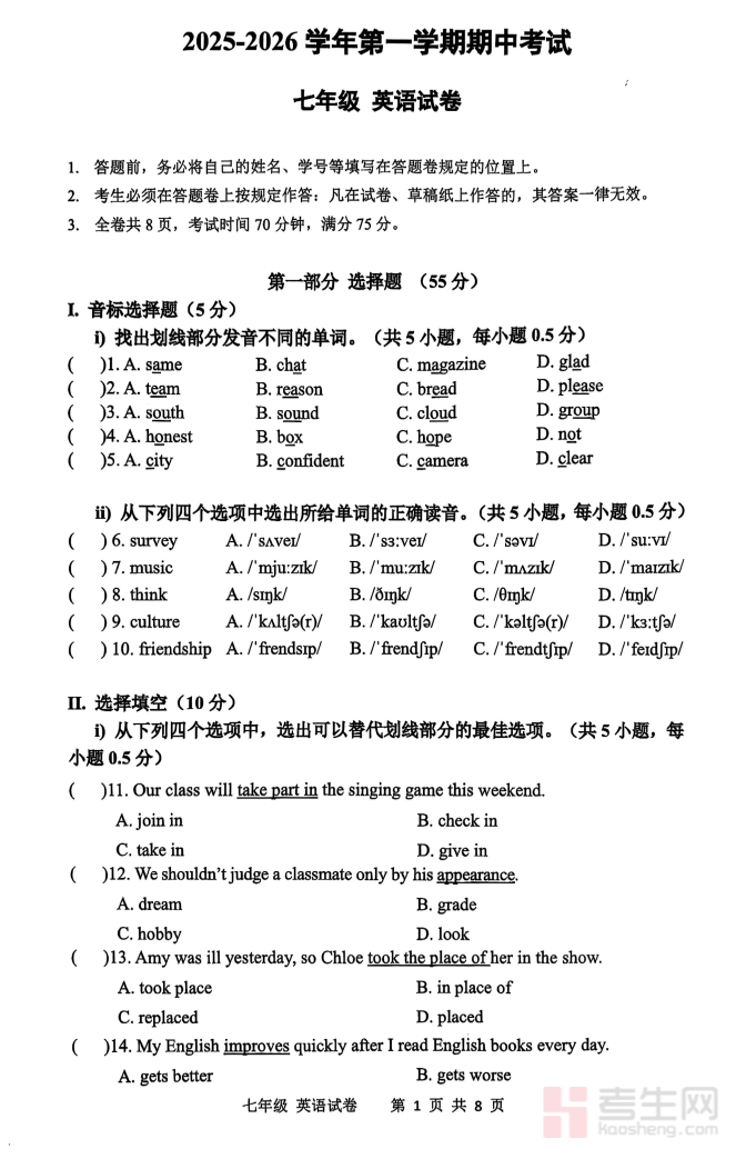 广东省深圳市罗湖区深圳中学2025-2026学年七年级上学期期中英语试卷 (含答案)