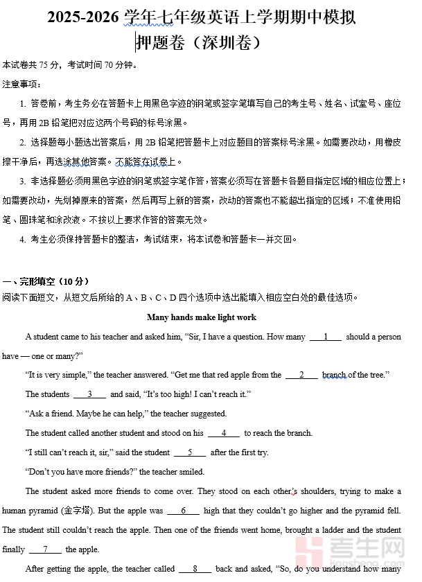 2025-2026学年七年级英语上学期期中模拟押题卷(深圳专用)(含解析)