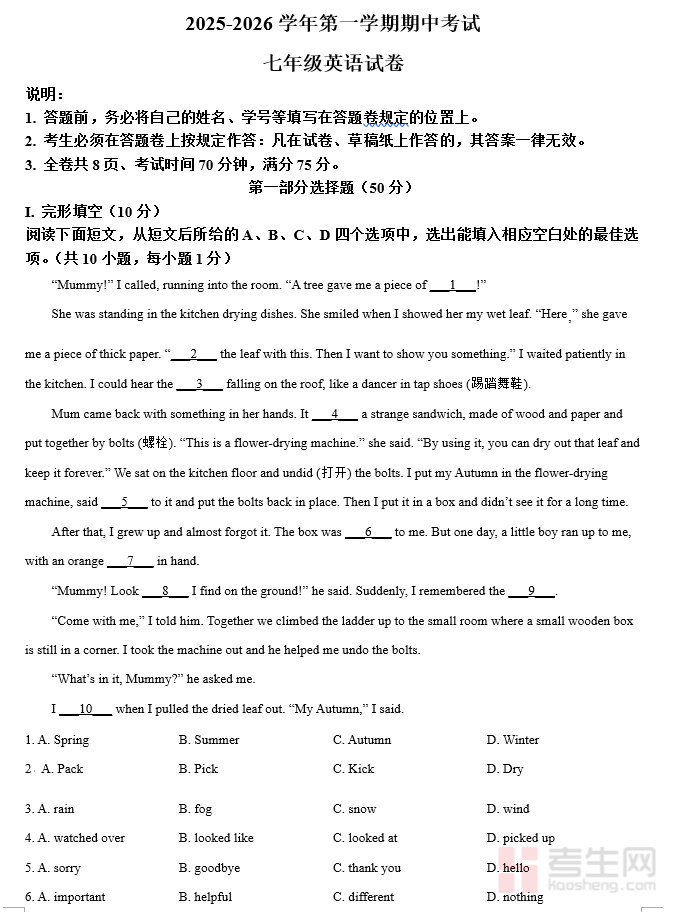 精品解析:广东省深圳市福田区福田实验教育集团侨香学校2025-2026学年七年级上学期期中考试英语试卷(含解析)