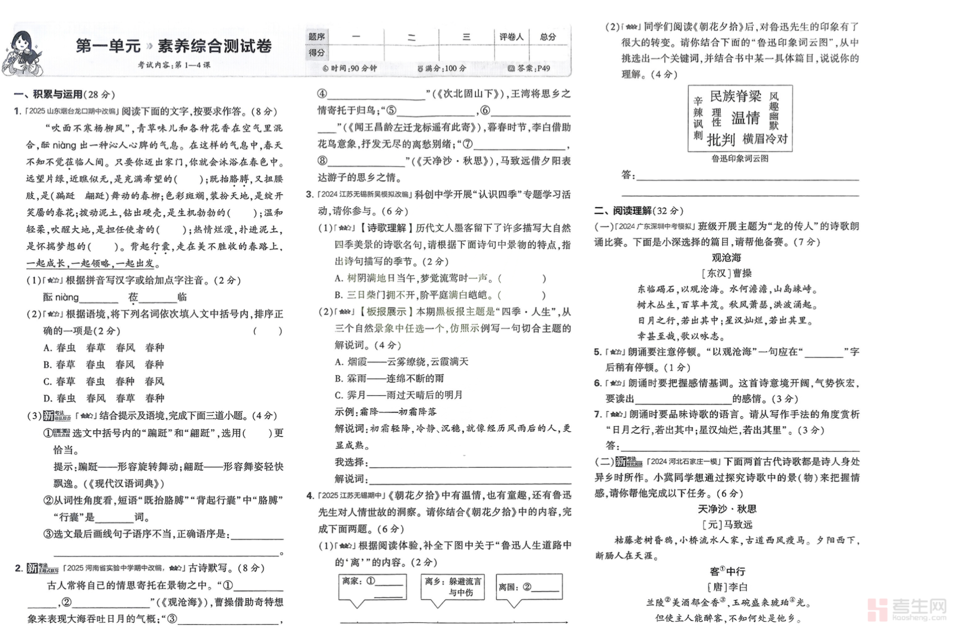 语文部分注重阅读理解与读写能力培养,题目分层合理:基础题打牢字词、古诗文等核心知识,中档题强化阅读答题方法与写作技巧,难题突破文本解读与创意表达瓶颈,助力循序渐进提升语文水平。排版清晰,答案单独整理,方便自主练习、自我检测。