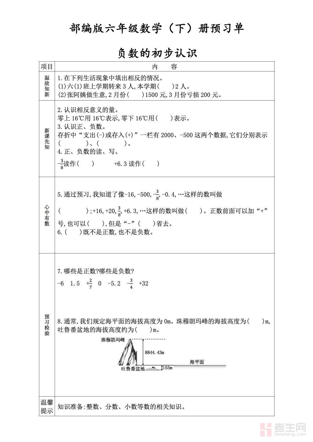 人教版六年级数学下册《课前预习单》:高效预习,领跑下册学习