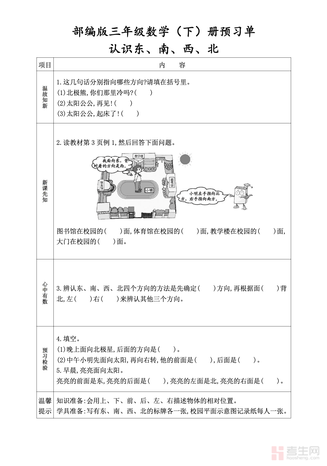 设计贴合三年级学生认知特点,语言简洁易懂、步骤清晰,无需家长过多辅导即可独立完成。每单元末尾设置 “预习小结”,引导孩子自主梳理知识框架,培养归纳总结能力。通过这份预习单,孩子能提前熟悉新课内容,带着问题听课,针对性解决薄弱点,既提升课堂学习效率,又夯实数学基础,还能培养自主学习习惯,轻松领跑三年级下册数学学习!