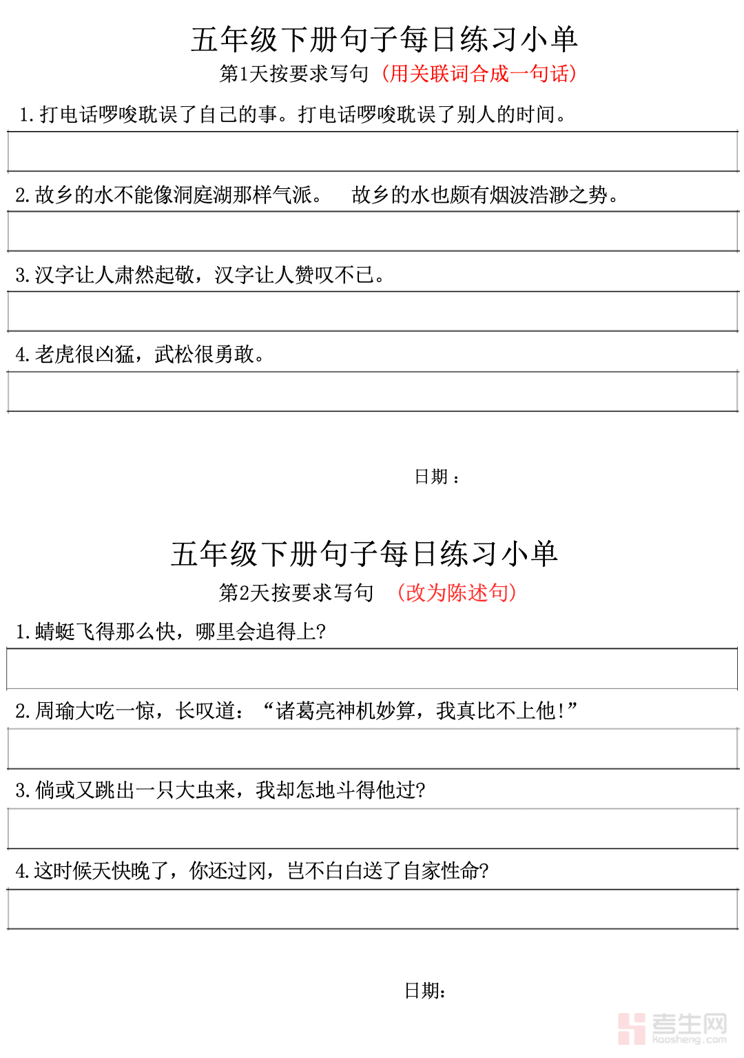 排版条理清晰、重点突出,可直接打印练习,适配课前预习、课后巩固、日常打卡、假期练习等多种场景,是五年级孩子精练句式、提升语用能力的实用素材,助力孩子吃透课内句子考点,稳步提升语文基础能力!