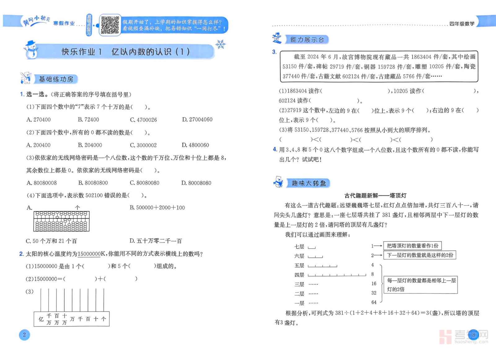 四年级是小学数学思维进阶、知识体系搭建的关键期,寒假高效练题既能扫清上册知识漏洞,又能提前铺垫下册核心内容,为新学期学习筑牢根基!《黄冈小状元寒假作业》数学四年级下册(人教版),紧扣人教版教材考点,科学编排复习与预习双模块,打造适配四年级学情的寒假精练体系,温故知新、靶向提能,轻松衔接新学期数学学习。