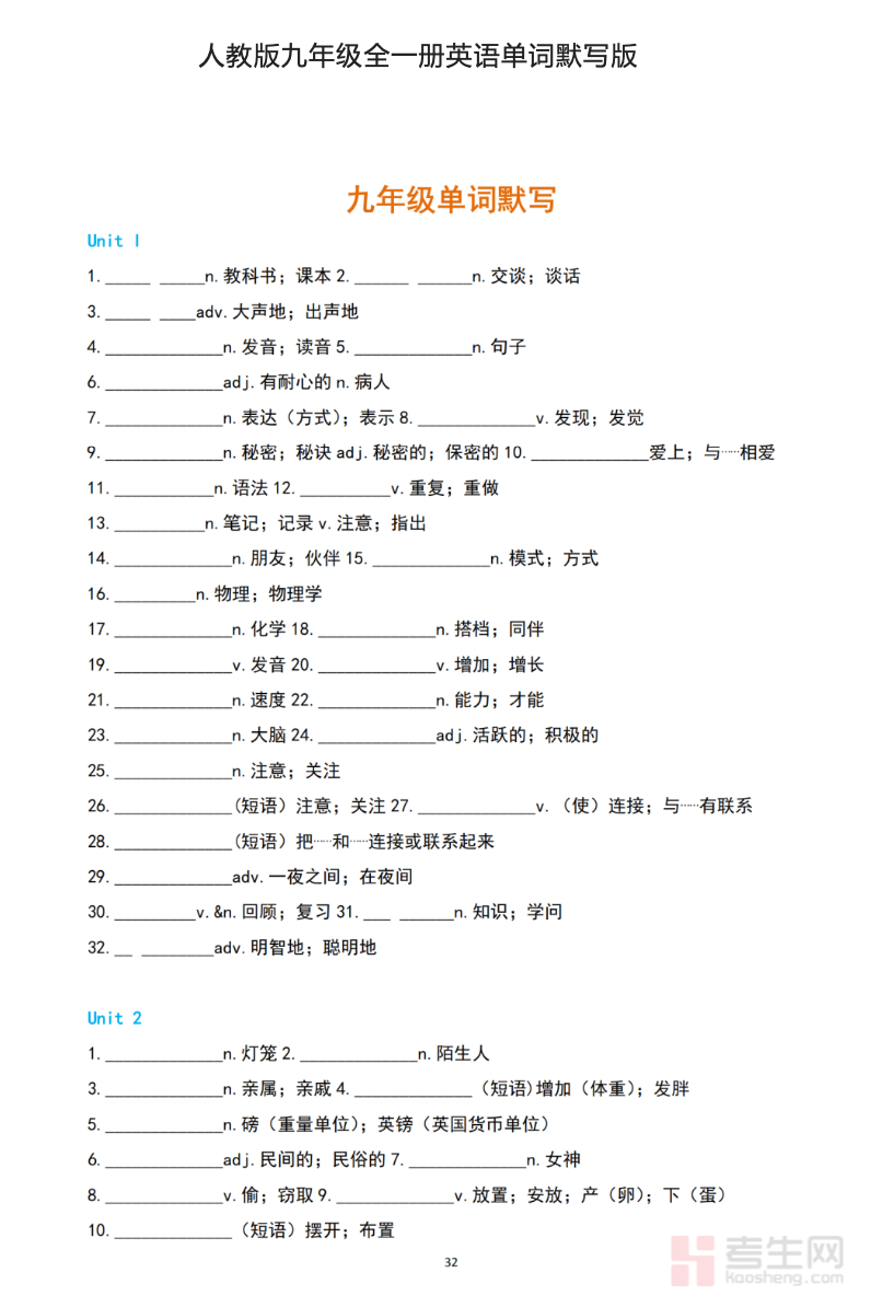 默写表排版清晰、重点突出,按教材单元拆分单词,每单元单词对应音标、词性,方便学生对照课本同步默写、自查纠错,快速夯实词汇基础;适配课堂默写、课后巩固、假期复习等多种场景,既能作为学生自主积累单词的便捷资料,也可作为教师课堂默写、家校听写的辅助工具,高效突破九年级英语词汇难点,为英语阅读、写作、听力学习筑牢词汇根基。