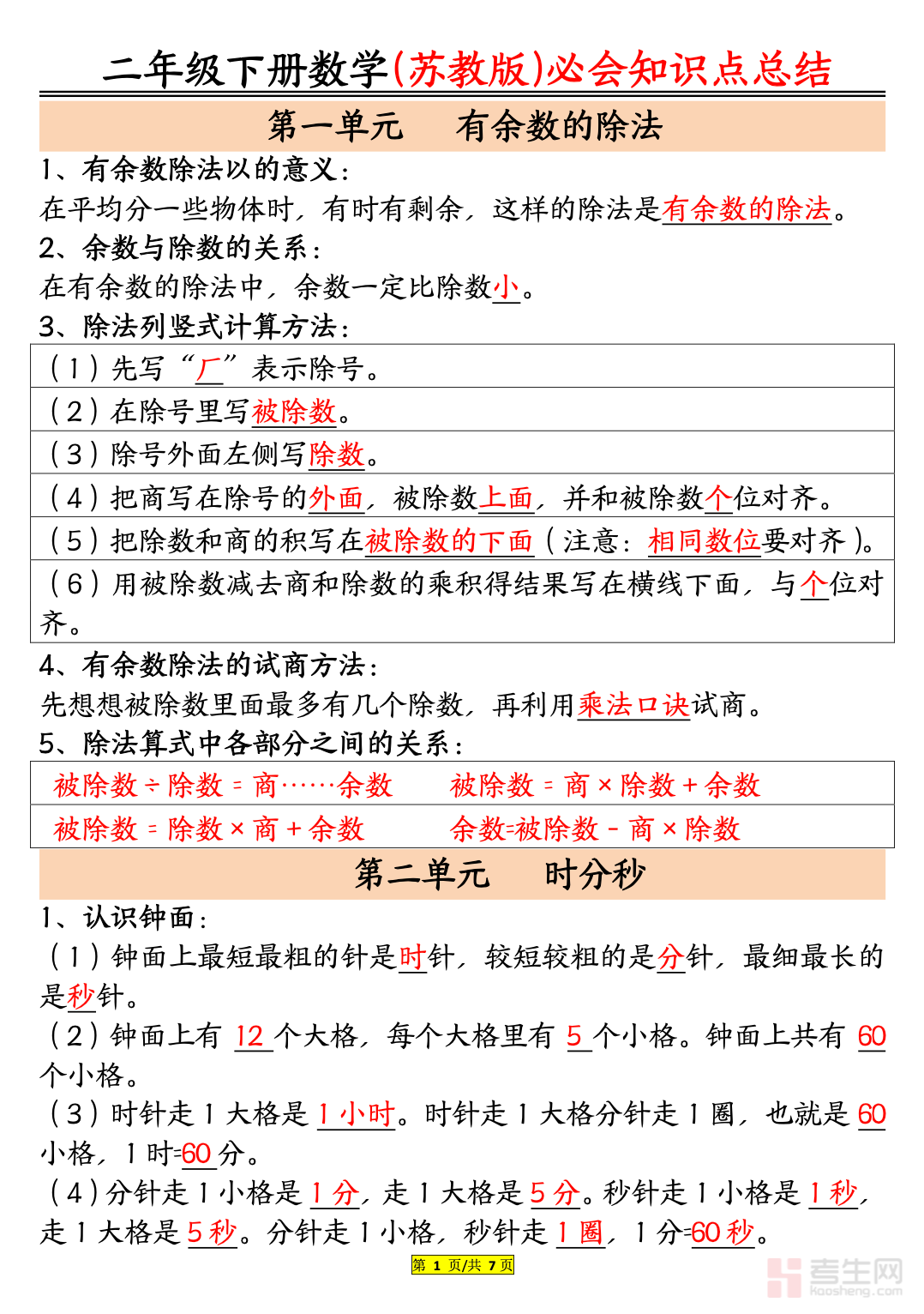 本汇总严格遵循苏教版教材编排逻辑,精准拆解下册数学核心模块,涵盖有余数的除法、万以内数的认识、分米和毫米、加减法、图形的运动等重点内容,表述简洁易懂,贴合二年级学生认知水平,方便快速查阅、重点识记、查漏补缺。