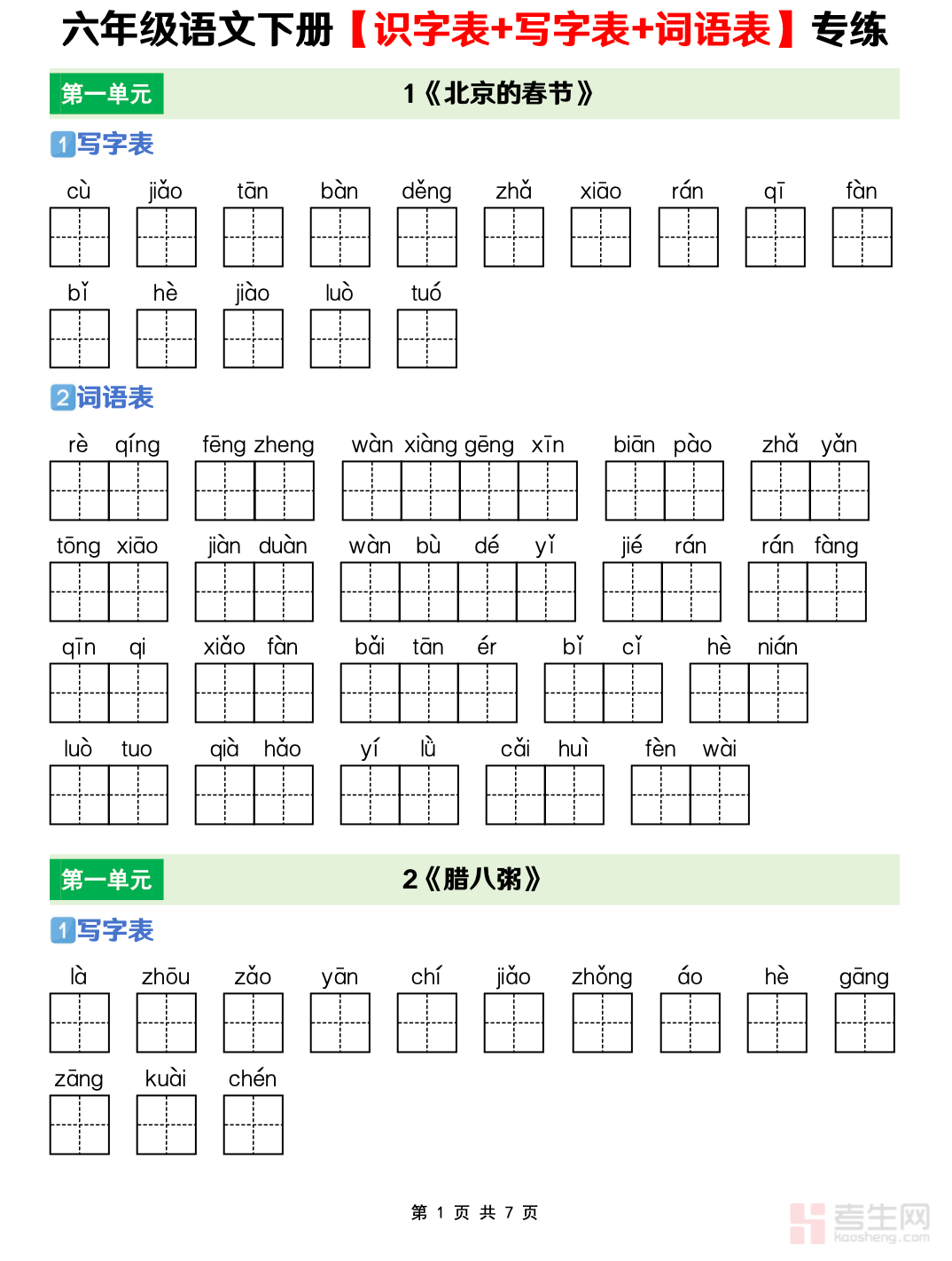 小学语文【识字表+写字表+词语表】专项训练 六年级(下册)