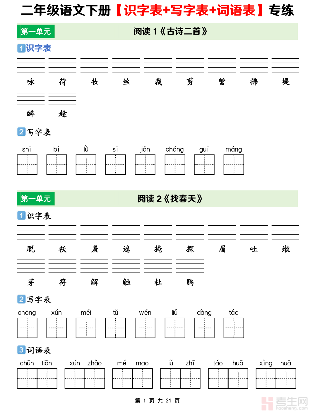 小学语文【识字表 + 写字表 + 词语表】专项训练,紧扣小学语文教材核心要求,整合课本识字表、写字表、词语表全维度内容,针对性设计专项练习,是夯实小学语文识字、写字、词语基础的实用专项资料。