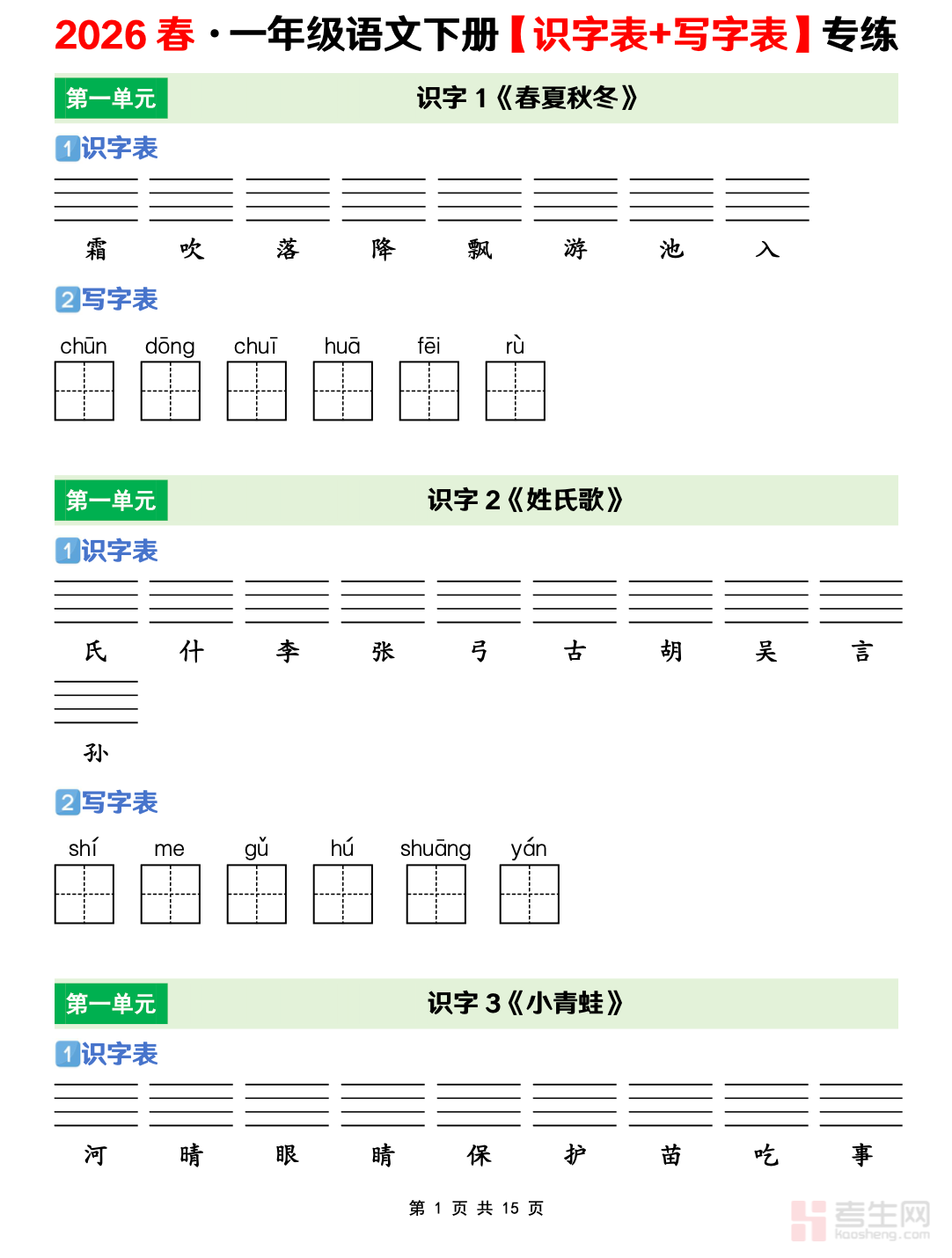 小学语文【识字表+写字表+词语表】专项训练 一年级(下册)