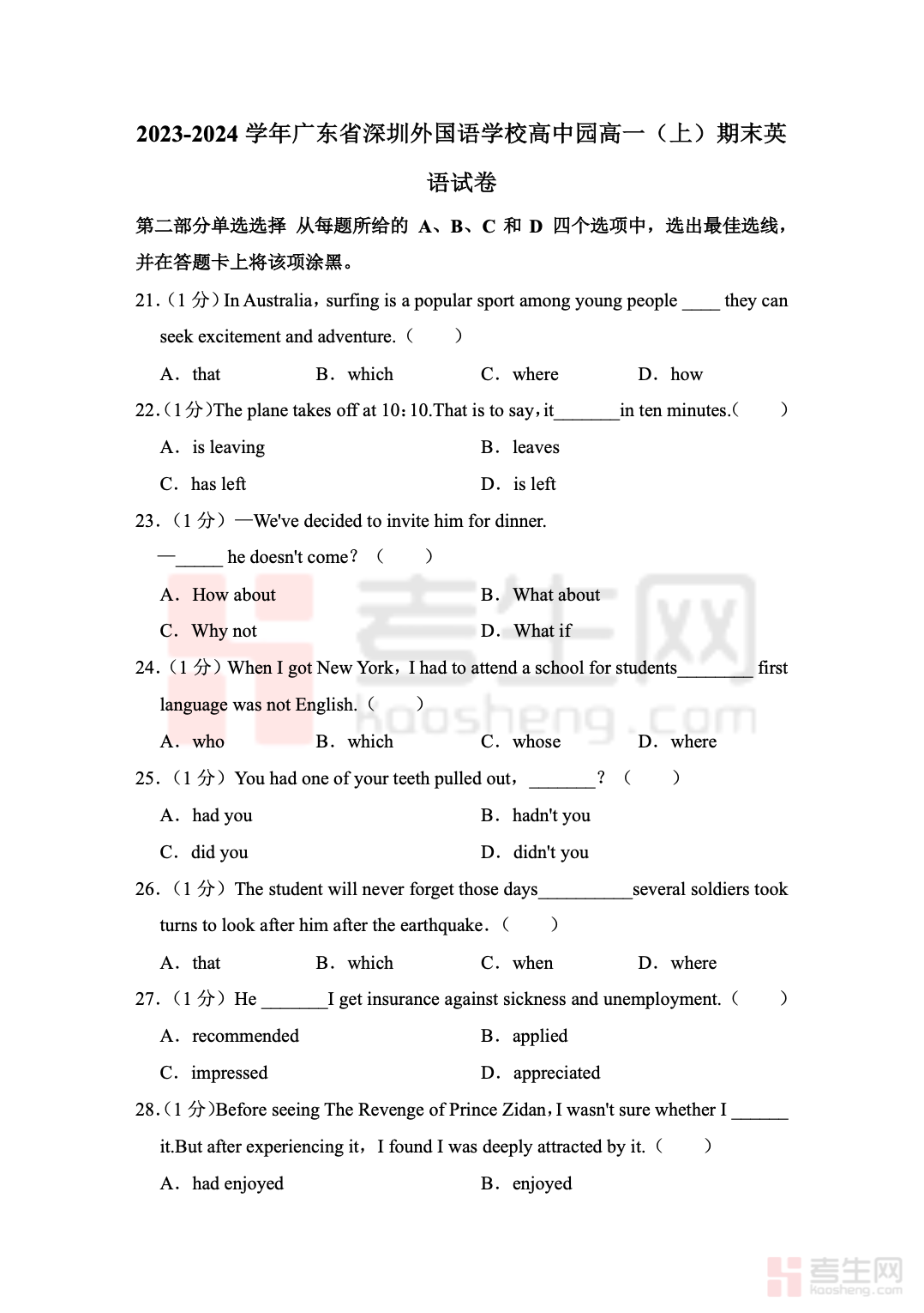 2023-2024学年广东省深圳外国语学校高中园高一(上)期末英语试卷