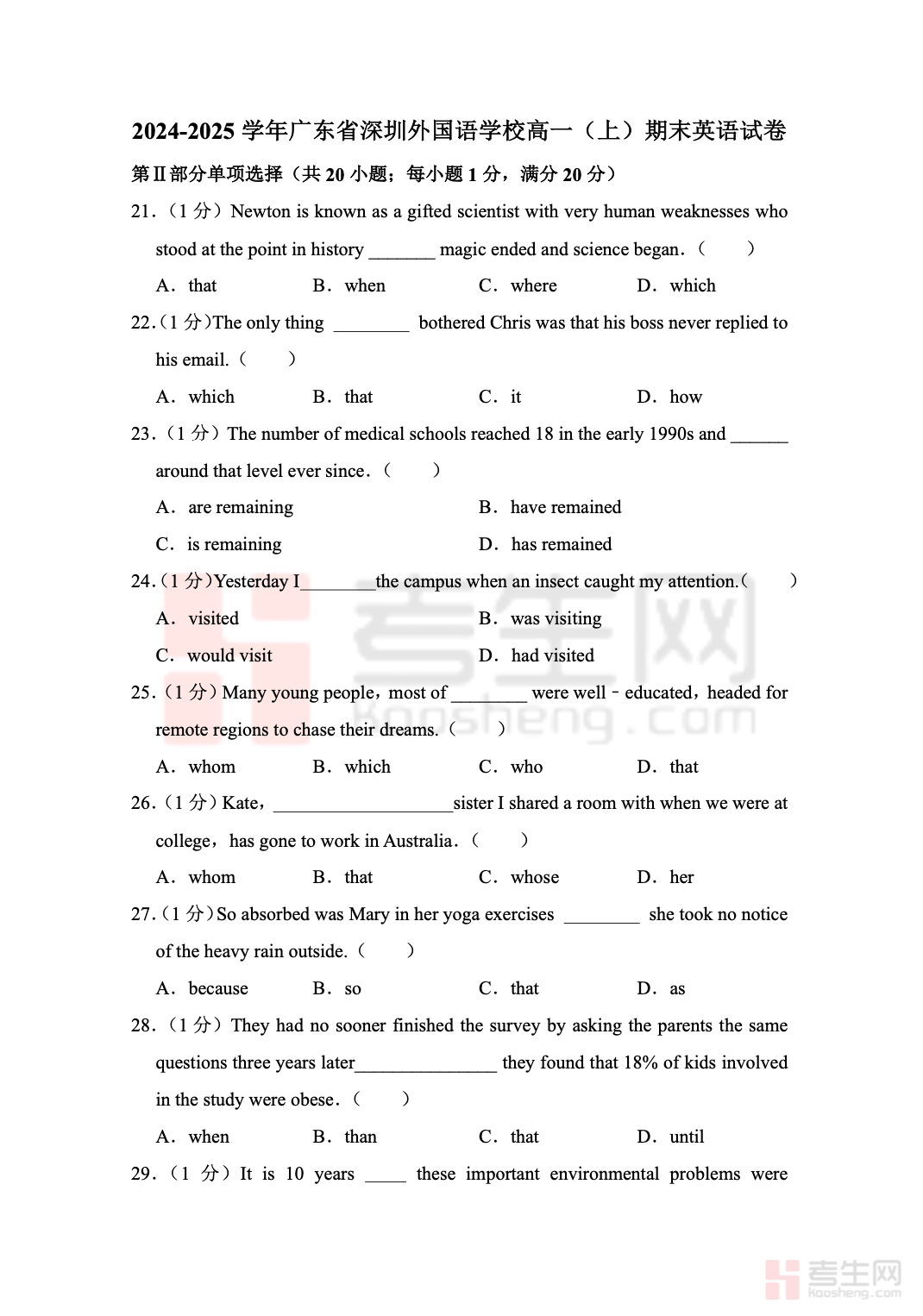 适配深圳地区高一上学期英语教学进度与期末考查要求,精选深圳本地各名校高一上英语期末考试真题,精准贴合深圳高一英语教材重难点与期末命题趋势,是深圳高一学生期末备考、查漏补缺、实战演练的优质资料。