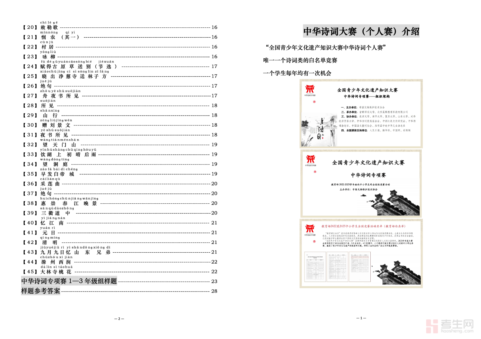 《诗词大赛手册》专为各类诗词大赛备考设计,精准贴合竞赛考查趋势,整合古今经典诗词篇目,兼顾诗词积累、赏析与应试技巧,是中小学学生、诗词爱好者备战诗词大赛、提升诗词素养的实用必备资料。