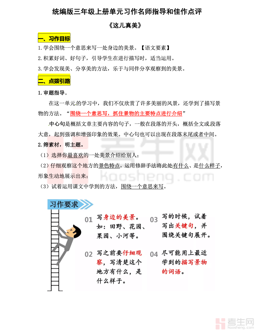 适配统编版三年级语文上册同步习作学习,聚焦《这儿真美》名师专项指导,精准对接小学三年级写景习作的核心考点、写作难点与表达易错点,是提升写景作文写作能力的优质辅导资料。本资料由名师拆解习作要求,梳理写景作文的观察方法、行文结构、词句运用技巧,针对写景无顺序、画面不生动、语言平淡等常见问题,搭配优秀范文赏析、句式积累与写作思路点拨,总结实用写作模板。内容贴合三年级学生认知,条理清晰、讲解通俗,摒弃复杂理论,直击习作得分核心,适配学生同步练笔、考前习作提升,也可作为家长辅导、教师课堂教学的辅助资料,助力夯实写景习作基础。