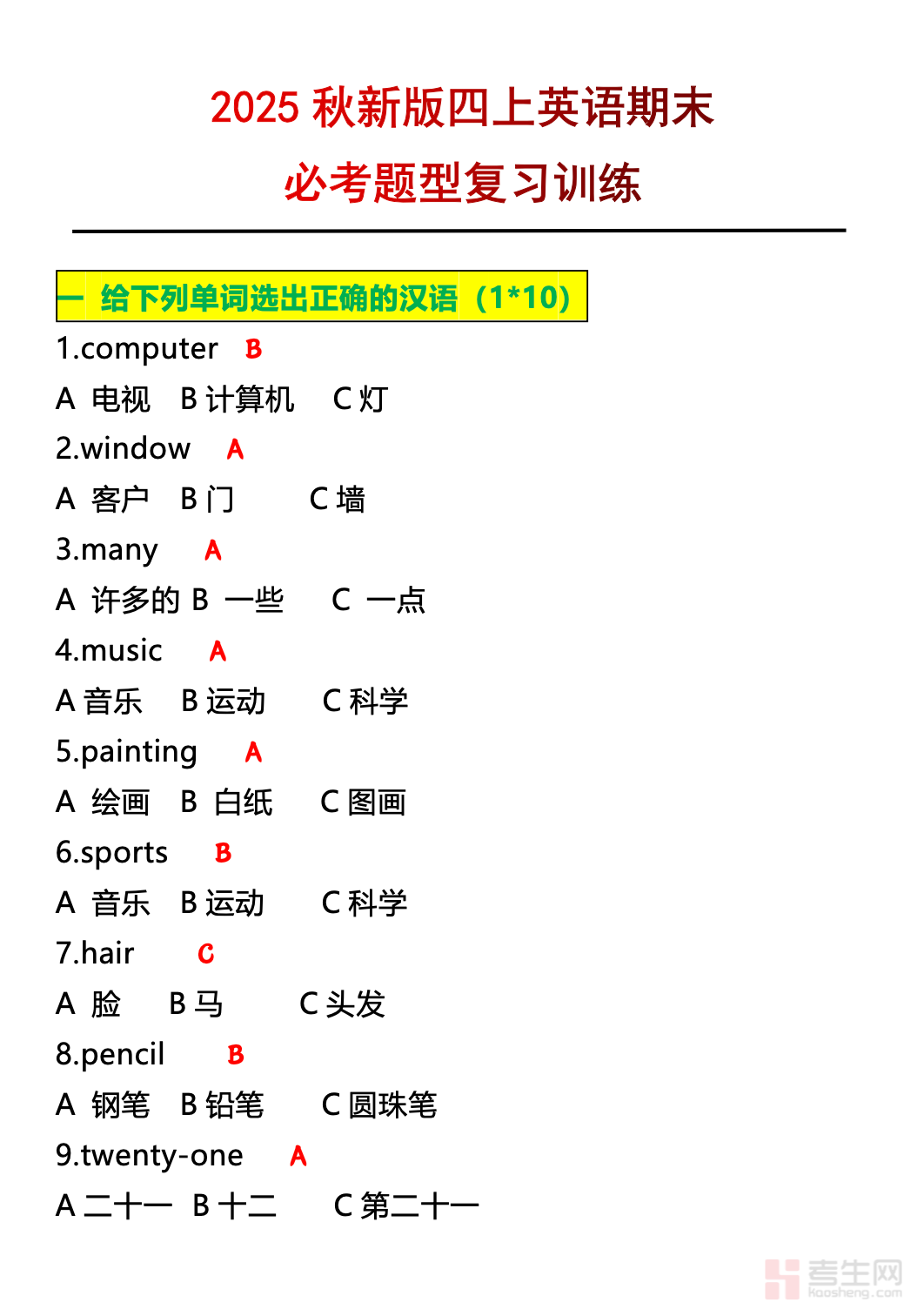 适配四年级上册英语期末冲刺备考需求,聚焦校内期末高频必考题,针对性设计专项复习训练,是夯实知识、提升应试能力的优质学习资料。本资料紧扣四年级上册英语教材核心考点,梳理词汇、句型、语法等必考内容,精选典型必考题,题型贴合校内期末考情,覆盖选择、填空、句型转换、阅读理解等常见题型,分层兼顾基础巩固与难点突破。训练内容贴合四年级学生认知水平,重点突出、针对性强,直击期末考试高频失分点。适配学生期末专项刷题、查漏补缺、考前强化,也可作为家长辅导、教师课堂复习的辅助资料,助力高效备战期末,稳提英语成绩。
