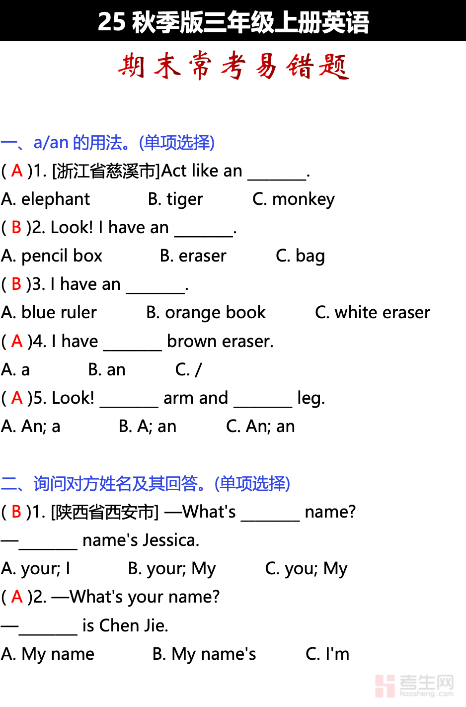 适配三年级上册英语期末备考需求,聚焦校内期末高频考查的易混、易错知识点,精选典型易错题汇编成专项练习,是精准避坑、夯实基础的优质复习资料。本资料紧扣三年级上册英语教材核心考点,针对词汇辨析、句型运用、语法搭配等高频失分点选题,题型贴合校内期末考情,覆盖选择、填空、连词成句等基础题型,每类错题贴合三年级学生认知特点,直击学习薄弱点。内容重点突出、针对性强,无需复杂讲解,适配学生期末专项纠错、查漏补缺、考前强化,也可作为家长辅导、教师课堂复习的辅助资料,助力规避考试易错点,稳提英语期末成绩。