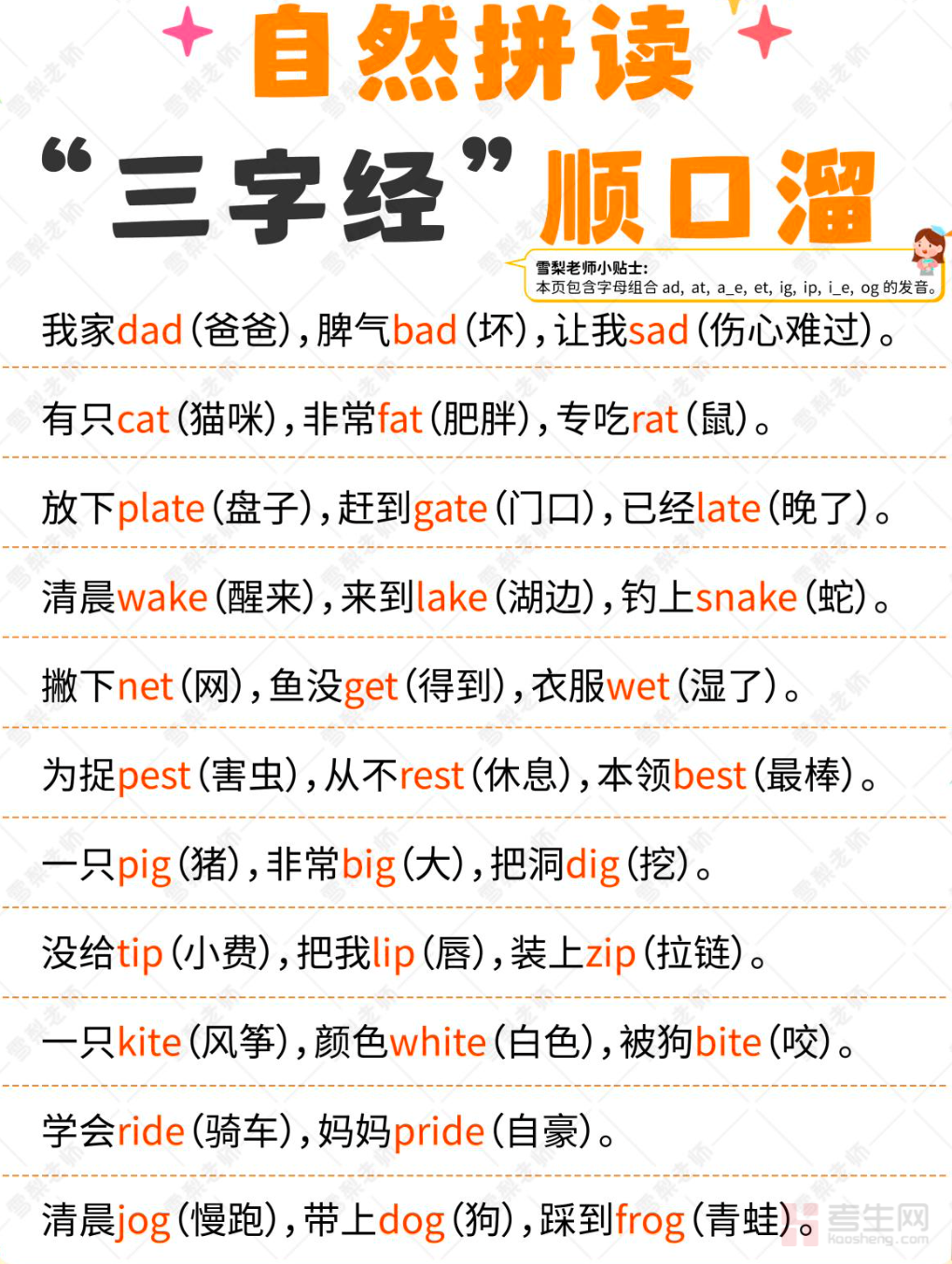 适配小学英语启蒙及自然拼读入门学习需求,将自然拼读规则融入三字经顺口溜,告别枯燥记忆,轻松掌握拼读技巧,是夯实英语拼读基础的趣味学习资料。本资料紧扣自然拼读核心规律,把字母、字母组合的发音规则编成朗朗上口的三字经顺口溜,句式简短、节奏明快,贴合孩子的记忆特点,解决传统拼读学习易混淆、记不牢的问题。内容按拼读知识点分类,难度循序渐进,无需死记硬背,读几遍就能快速掌握,兼顾趣味性与实用性。适配低龄孩子自主记诵、家长亲子伴学,也可作为英语课堂启蒙辅助资料,助力在轻松诵读中吃透拼读规则,培养英语认读能力,为单词认读和拼写筑牢基础。