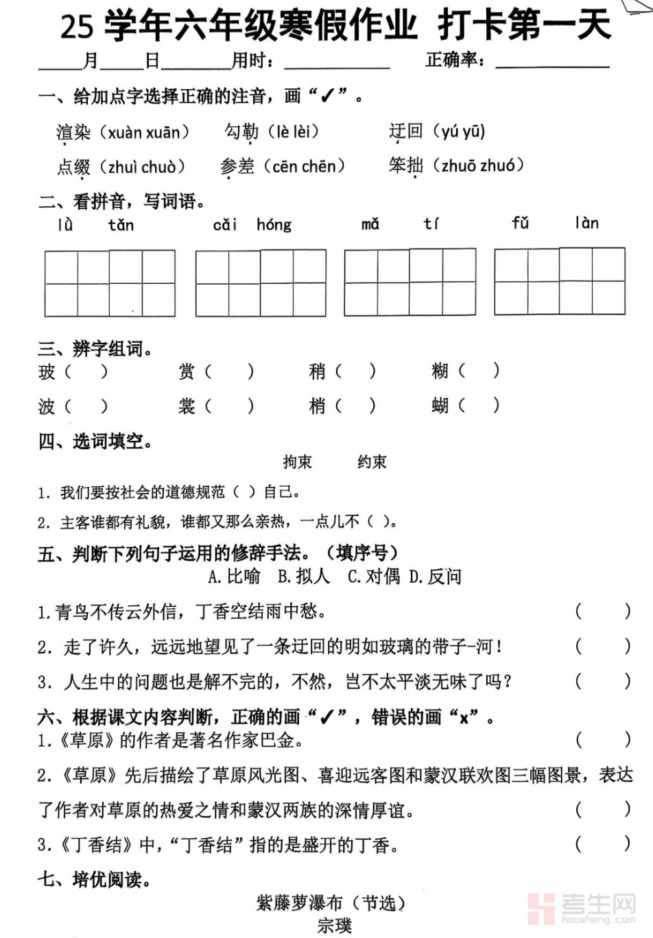 适配六年级学生 2025 寒假语文自主学习需求,打造 20 天系统化每日打卡作业,贴合寒假学习节奏,是夯实语文基础、衔接小升初的优质寒假学习资料。本资料紧扣六年级语文核心考点,按天规划打卡内容,覆盖字词积累、古诗文记背、阅读理解、语段练笔等寒假必练模块,每日任务量适中、难易合理,兼顾基础巩固与能力提升,告别寒假盲目刷题。打卡内容贴合校内教学要求,题型经典、针对性强,适配学生自主打卡、每日练笔,也可作为家长寒假辅导、督促孩子学习的辅助资料,助力高效利用寒假查漏补缺,稳扎语文基础。