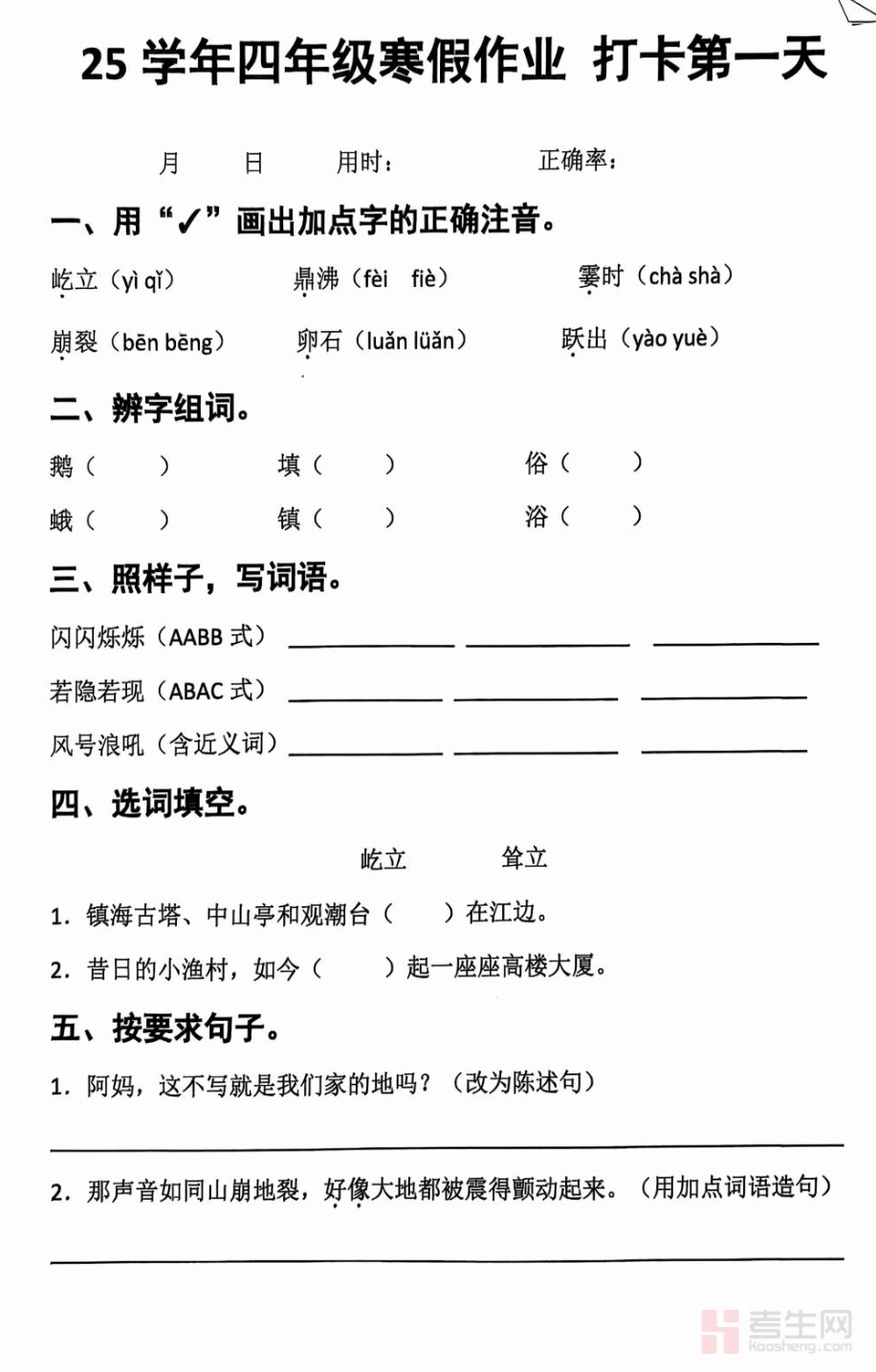 适配四年级学生 2025 寒假语文自主学习需求,打造 20 天系统化每日打卡作业,贴合寒假轻松学习的节奏,是夯实语文基础、衔接下学期知识的优质寒假学习资料。本资料紧扣四年级语文核心考点,按天规划打卡内容,覆盖字词听写、古诗文积累、阅读理解、语句练笔等寒假必练模块,每日任务量适中、难易适配,兼顾基础巩固与能力轻量提升,告别寒假盲目刷题。打卡内容贴合校内教学要求,题型经典、针对性强,适配学生自主打卡、每日练习,也可作为家长寒假辅导、督促孩子学习的辅助资料,助力高效利用寒假查漏补缺,稳扎语文学习根基。